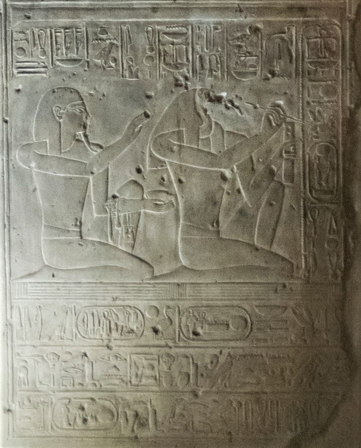 Za Nim Bóg, którego imię nie jest wyryte: prawie na pewno jest to Jr, Bóg wzroku, który jest również przedstawiony na dolnym fryzie południowego ościeża Bramy Wejściowej Wewnętrznych Sanktuariów Ra-Harakhty, Izydy i Ozyrysa.