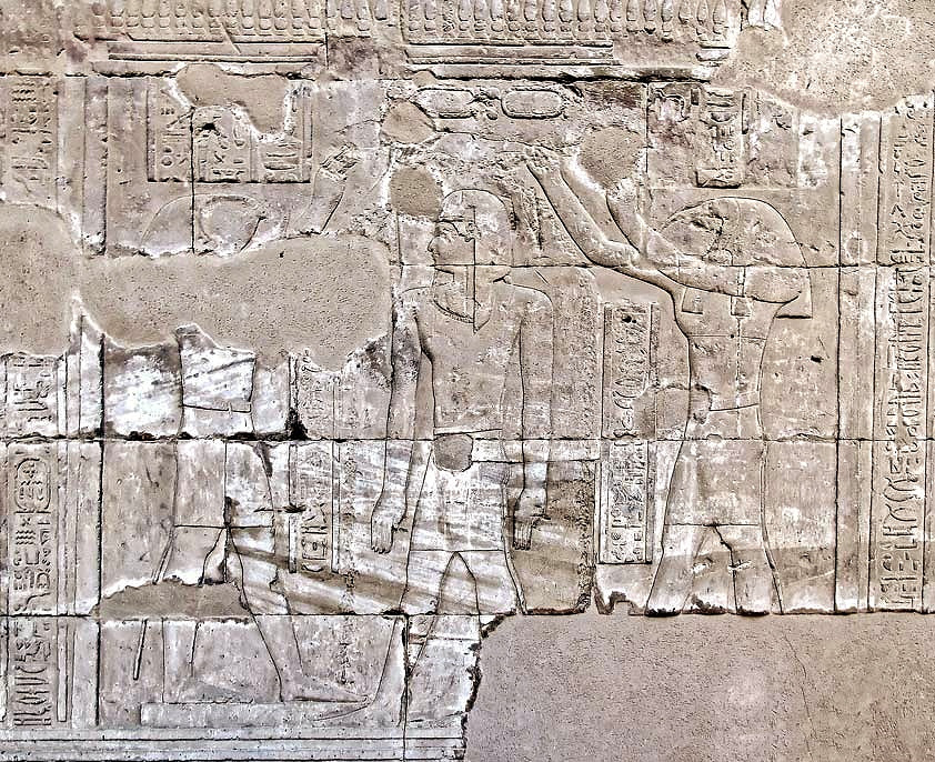 Scena przedstawiona jest wewnątrz sanktuarium, zwieńczonego fryzem kheker.