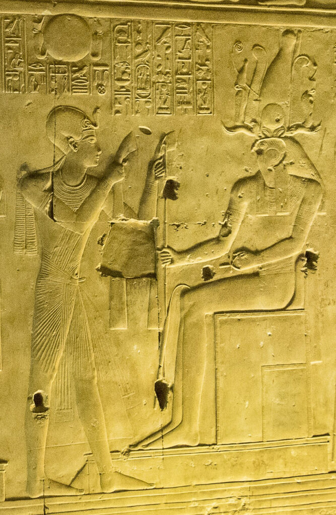 Horus jest przedstawiony z głową sokoła, noszący złożoną Podwójną Koronę, ujętą po bokach przez dwa pióra strusie, a także rogi baranie oraz dwie ureusze – reprezentujące boginie Nekhbet i Wadżet: